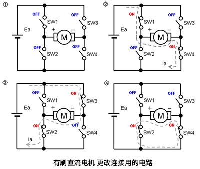 有刷直流電機通常具備兩個電源接線端子,通過這兩個端子施加電壓以驅動電機。這兩個端子存在以下四種基本的連接方式: