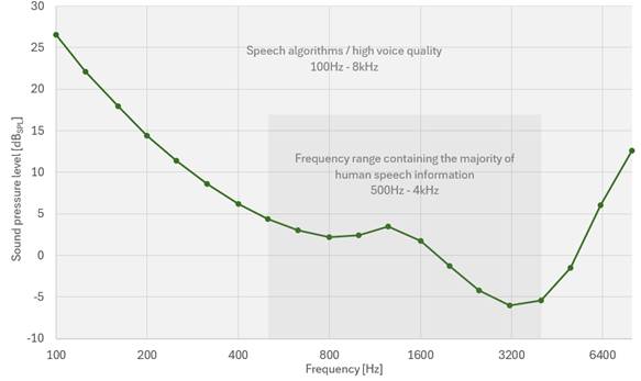紅色線條的是信噪比為65dB(A)的麥克風的等效噪聲級ENL曲線,麥克風集成了防塵設計。相應的MEMS麥克風目前已用于多家供應商生產的多款高端智能手機中。