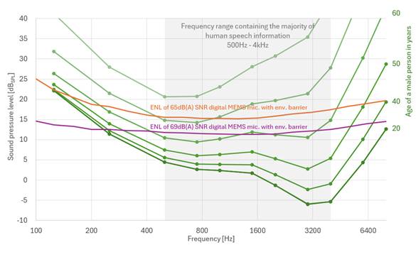 圖 3:中端和高端MEMS麥克風的1/3倍頻程等效噪聲級ENL與典型男性聽力閾值的比較