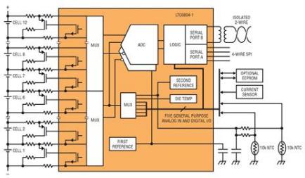 這就是 LTC6804 多電芯電池監(jiān)控器 IC(圖 4)在 Nuvation BMS 實(shí)施中起關(guān)鍵 作用的原因。它專(zhuān)為滿足 BMS 系統(tǒng)和多電芯設(shè)計(jì)需求而定制,可對(duì)多達(dá) 12 個(gè)串 聯(lián)堆疊的電池電芯進(jìn)行精確測(cè)量。其測(cè)量輸入不以接地作為參考,這大大地簡(jiǎn)化 了這些單元的測(cè)量,而 LTC6804 本身可進(jìn)行堆疊與高電壓陣列一起使用(它還支 持各種電芯化學(xué)特性)。它提供最大 0.033%誤差和 16 位分辨率,只需要 290μs 即可測(cè)量電池堆棧中的所有 12 個(gè)電芯。這種同步電壓和電流測(cè)量對(duì)于產(chǎn)生有意 義的功率參數(shù)分析至關(guān)重要。