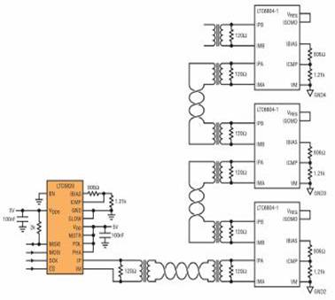 圖 5.LTC6804 支持隔離式 SPI 接口,可通過(guò)菊花鏈方式連接構(gòu)成更大的陣列,從而實(shí)現(xiàn)可靠 的抗電磁干擾互聯(lián),盡量降低布線要求,減少隔離器數(shù)量