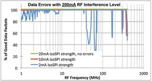 圖 6.LTC6804 和 isoSPI 接口上的測(cè)試結(jié)果顯示,輸入射頻為 200mA ,isoSPI 在 20mA 信號(hào)強(qiáng)度下運(yùn)行時(shí)沒(méi)有出現(xiàn)數(shù)據(jù)錯(cuò)誤