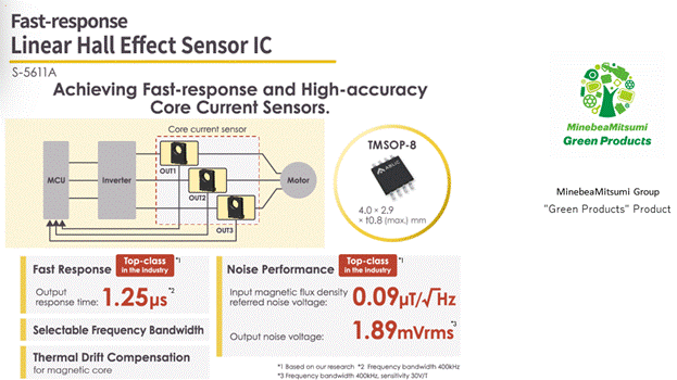 今天推出的新產(chǎn)品「S-5611A」是可編程的高精度線性霍爾效應(yīng)IC,實(shí)現(xiàn)業(yè)界最快速度的1.25μs高速響應(yīng)(※2)和業(yè)界最小等級(jí)的0.09μT/√Hz低噪音(※3),可以正確測(cè)量微小的電流變動(dòng),有助于提高換流器控制性能。