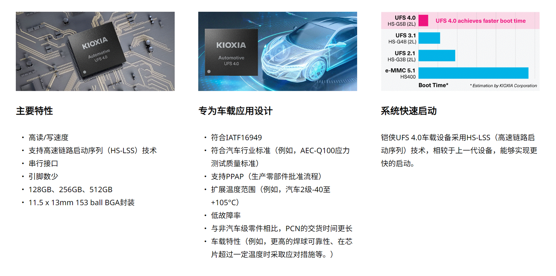 如果打開鎧俠UFS 4.0介紹頁面,就可以看到針對車規應用設計的認真標準,包括前面提到的IATF 16949,AEC-Q100應力測試質量標準,PPAP,工作溫度符合2級-40℃到+105℃等更大范圍。