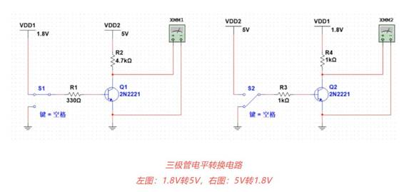 以1.8V轉5V為例,當開關S1接到1.8V時,Q1導通,Q1集電極的電壓為0V,當S1接地時,Q1截止,Q1集電極的電壓為5V,5V轉1.8V也是同理。