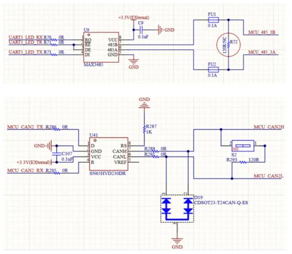 通訊接口的轉換非常簡單,直接選用對應的通訊芯片就可以了。例如,RS485通訊時可以選擇MAX485,RS232可以用MAX232,CAN可以選SN65HVD230DR,方案基本都是固定的,按照對應芯片的數據手冊設計電路就沒什么問題。
