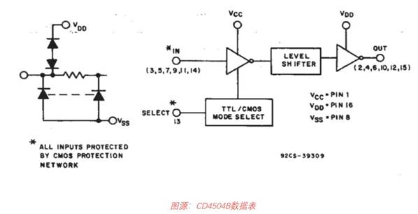 由上圖可以看出,TTL邏輯電平與CMOS邏輯電平之間存在差異,但是,我們通過分析發現,他們的電平在一定區間是有兼容性的,既然能兼容,那是不是可以不轉換,這是不可以的,這里舉個例子,以5VTTL和CMOS對比,比如一個信號速率為10GHZ,在TTL電平下,確定為高電平是2V以上,而在CMOS電平下,確定為高電平是3.5V以上,之間差了1.5V,我們都知道,信號的上升是需要時間的,在10G的速率下,這個確認電平的時間差值就非常重要,這個時間差會造成信號時序錯誤,終將導致信號傳輸失敗,所以TTL與CMOS邏輯電平之間也需要進行轉換,通常TTL轉CMOS需要使用專門的轉換芯片,例如CD4504B,它就可以實現TTL轉CMOS。