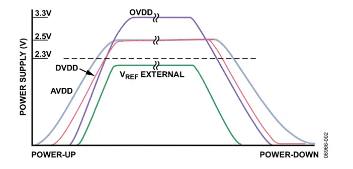 該ADC的問題與基準電壓有關,它必須小于AVDD + 0.3 V。因此,AVDD必須先于基準電壓或與之同時上電。