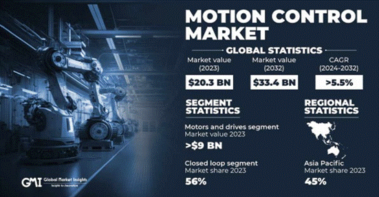 隨著工業自動化、智能制造和物聯網的發展,市場對運動控制解決方案的需求持續增長。作為驅動機械運動的關鍵技術,電機和運動控制系統被廣泛應用于工業自動化、機器人、消費電子、醫療設備、自動駕駛以及智能家居等多個行業。據市場調研公司GMI預測,2023年,全球運動控制市場的規模約為203億美元;市場預計在2024至2032年期間的復合年增長率(CAGR)為5.5%,2032年,市場規模預計達到334億美元。