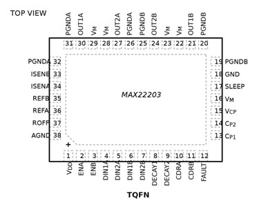MAX22203具有過流保護(OCP)、熱關斷(TSD)和欠壓閉鎖(UVLO)功能。每次檢測到故障條件時,都會激活一個開漏低電平有效nFAULT引腳。在熱關斷和欠壓鎖定期間,驅動器為三態,直到恢復正常工作為止。該期間采用小型TQFN38 5mm x 7mm封裝。