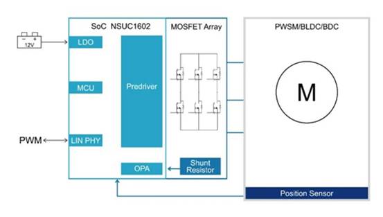 作為國內領先的汽車芯片供應商,納芯微繼2023年初國內首發車用小電機驅動SoC NSUC1610后,今日正式宣布推出高集成度嵌入式電機控制IC NSUC1602。與集成了LIN和MOS功率級的單芯片NSUC1610相比,NSUC1602集成式SoC支持外置獨立功率MOSFET的設計,這一創新方案能夠輕松應對更大電流需求的場景。