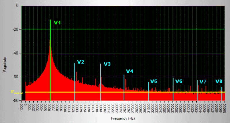 為了可視化 ADC 輸出中的諧波失真,我們將提供一個(gè)正弦波作為 ADC 的輸入,并繪制 ADC 數(shù)字輸出的傅里葉變換(又名 FFT)。圖 1 顯示了此類 ADC 輸出的 FFT 示例。理想情況下,F(xiàn)FT 應(yīng)在正弦波頻率處具有單個(gè)頻率尖峰。盡管輸入信號的頻率在 FFT 圖中具有幅度(FFT 中的綠色莖),但圖中還可以看到其他頻率內(nèi)容。輸入信號頻率稱為基頻。除了基頻分量之外,F(xiàn)FT 中還會周期性地出現(xiàn)尖峰(藍(lán)色莖)。這些是輸入信號頻率的諧波。