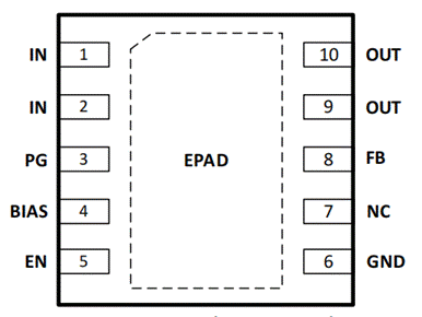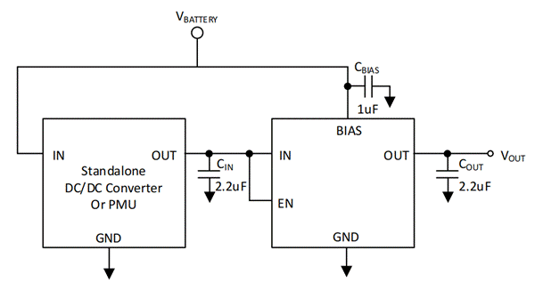 主電源路徑通過VIN,可連接至僅高于輸出電壓的值低至 150mV 的電源。該器件使用一個用于為 LDO 的內(nèi)部電路供電的附加 VBIAS 電源軌,支持極低的輸入電壓。IN 和 BIAS 引腳分別消耗 6.8µA 和 26µA 的極低靜態(tài)電流。低 靜態(tài)電流和超低壓差特性有助于提高功耗敏感型應用中解決方案的效率。例如:IN 引腳的電源電壓可以是高效直流/直流降壓穩(wěn)壓器的輸出,而 BIAS 引腳電源電壓可以是可再充電電池。