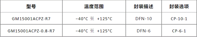 GM15001 采用小型 10 引腳 3mm × 3mm DFN 封裝,具備較低的熱阻,適用于對散熱要求高的應用。同時還提供小型 6 引腳 2mm × 2mm DFN 封裝,適用于空間受限型應用。