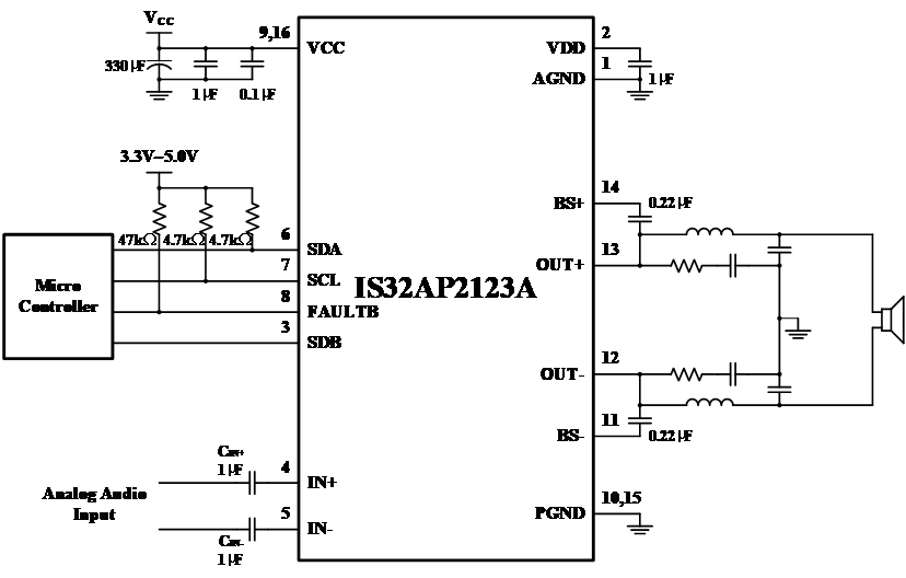 面對日益復雜的車載系統需求,絡明芯推出了一款符合AEC-Q100車規認證的高性能、高可靠性、低功耗、大功率的單聲道D類音頻功放芯片IS32AP2123A。該芯片高達24W輸出功率,高信噪比,完善的故障檢測機制,以及創新的基于自動增益控制(AGC)的輸出功率限制功能,不僅能保護揚聲器,又能保證輸出音量和音質,非常適合AVAS應用。IS32AP2123A典型應用電路如圖2。