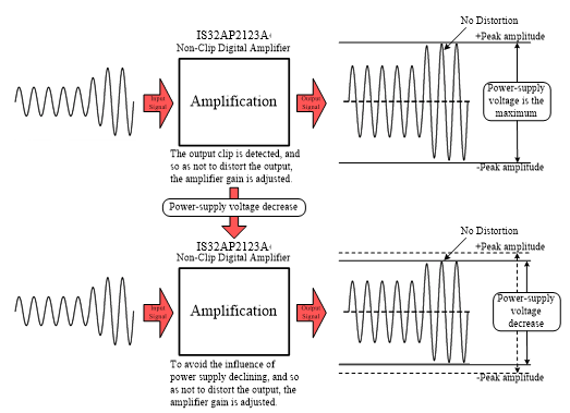 自動增益控制(AGC): IS32AP2123A創新的自動增益控制功能(AGC),可根據不同揚聲器型號限制輸出功率,以防止揚聲器因功率過大而受損。當輸出功率超過選定的功率限制水平時,自動增益控制(AGC)功能將被激活,放大器的增益會降低,從而使輸出功率回到限制值以下。相比其他廠家產品簡單的輸出功率限制功能不同,IS32AP2123A的AGC控制功能在限制功率的同時,不會導致輸出音頻信號出現削波,音質不會受到影響。
