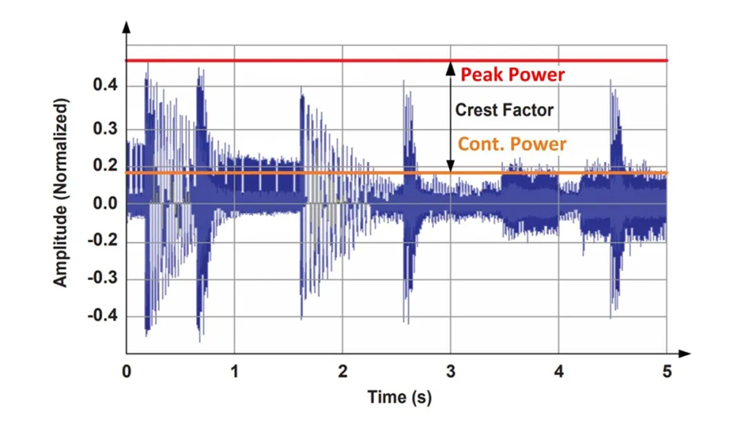 首先需要明確兩個術語:峰值功率和連續功率。峰值功率是最大瞬時音頻功率。它將決定電源可實際輸出的功率大小。連續功率是指一段時間內的平均音頻功率。在電源設計中,連續功率是指系統在不超過元件溫度或平均電流額定值的情況下可以提供的特定輸出功率。圖 1 提供了峰值和連續音頻級別的示例。它們與波峰因數(波形的峰值與均方根 (RMS) 值之比的度量)有關。