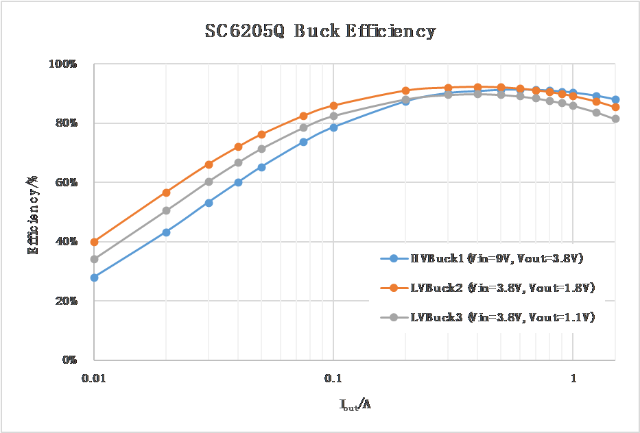 南芯在設計階段有效降低了芯片的等效串聯電阻 (ESR) 和等效串聯電感 (ESL),提升系統效率。以 SC6205Q 為例,其集成的降壓轉換器的峰值效率分別可達 91.2%、92.2%、89.8%。