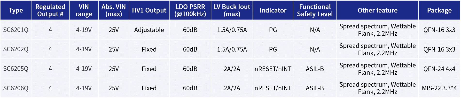 南芯科技在 ADAS 電源芯片領域早有布局,并于去年發布了單芯片車載攝像頭 PMIC 系列,通過安全高效的電源管理提升 ADAS 系統攝像頭的穩定性與可靠性。其中,SC6201Q 已于去年實現規模量產,符合 ASIL-B 功能安全標準要求的 SC6205Q 和 SC6206Q 也已步入規模量產階段,持續為 ADAS 應用保駕護航。