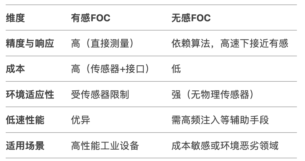 無感 FOC 算法則不需要使用專門的位置傳感器來檢測轉子位置,而是通過檢測電機的相電流、反電動勢或其他電氣量,利用復雜的算法來估算電機轉子的位置和速度。常見的方法有基于反電動勢法、定子磁鏈法、電感法等,也有采用位置觀測器和反正切或鎖相環(PLL)計算的組合來構成位置觀測算法。無感 FOC 算法同樣是將電機的電流和電壓進行坐標變換,在 dq 軸坐標系下進行控制,但轉子位置和速度的獲取是通過對采樣數據的計算和分析得到的。這種算法的優勢在于降低了系統成本,提高了可靠性和抗干擾性,減少了電機體積和復雜度,適用于對成本敏感、安裝空間有限且對控制精度要求不是極高的場合,如家用電器、電動工具、工業風機等。不過,無感 FOC 算法的缺點是在低速時,由于反電動勢較小,信號檢測和處理難度大,導致估算精度下降,控制性能不如有感 FOC 算法,且算法復雜度較高,對控制器的計算能力有一定要求。綜上所述,有感FOC和無感FOC之間的對比如下圖所示。