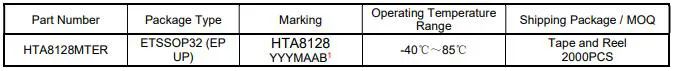 HTA8128 雙鋰電池7.4V:2×40W (VOUT=18V, THD+N= 10%) ; 三鋰電池12V:2×60W (VOUT=22V, THD+N = 10%) TSSOP-32 2.7V至VOUT 內置升壓的60W立體聲D類音頻功放芯片