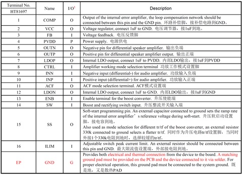 HT81697具有先進(jìn)的擴(kuò)頻功能來抑制EMI。如果系統(tǒng)對(duì)EMI高度敏感,則可以將升壓關(guān)閉,并將功放切換到AB類。 此外,HT81697集成了輸出端過流保護(hù)、片內(nèi)過溫保護(hù)、升壓過壓保護(hù)等功能。