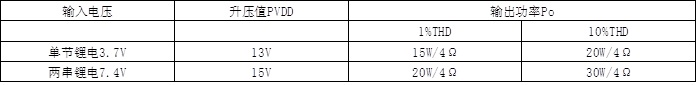 12.8W (VBAT=3.7V, RL=4Ω, THD+N=1%, PVDD = 12V, fIN = 1kHz)