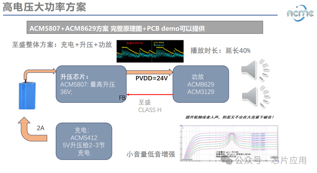 搭配大功率功放,例如3129/3128/8628/8629等,充分利用動態(tài)升壓的特點,播放時長和功率兼顧。