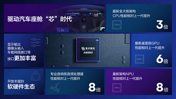 紫光展銳推出全新一代旗艦級智能座艙芯片平臺A8880,該平臺CPU性能相較上一代提升3倍,GPU性能提升6倍,NPU性能提升8倍,專業音響級音頻DSP,性能同比提升8倍,達行業領先水平。顯著的性能提升,為智能座艙提供了更流暢的交互體驗、更高質量的圖形處理和計算能力。