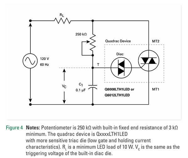 圖4注:電位器為 250 kΩ,內置固定端電阻最小為 3 kΩ。Quadrac 器件為 QxxxxLTH1LED,具有更靈敏的三端雙向晶閘管芯片(低柵極和保持電流特性)。RL 是 10 W 的最小 LED 負載,VC 與內置雙向可控硅芯片的觸發電壓相同。