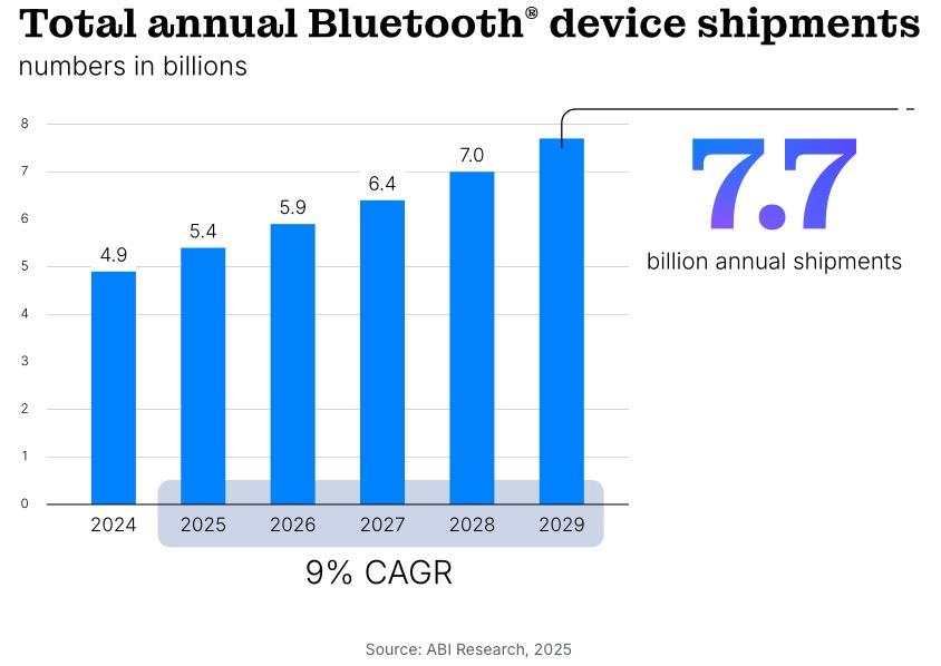 IT之家 5 月 13 日消息,藍牙技術聯盟(Bluetooth SIG)最新發布《2025 市場更新》報告,預估藍牙技術在 2025 年將迎來爆發期,全球設備出貨量預計超過 54 億臺,并有望在 2029 年攀升至 77 億臺,五年復合增長率為 9%。