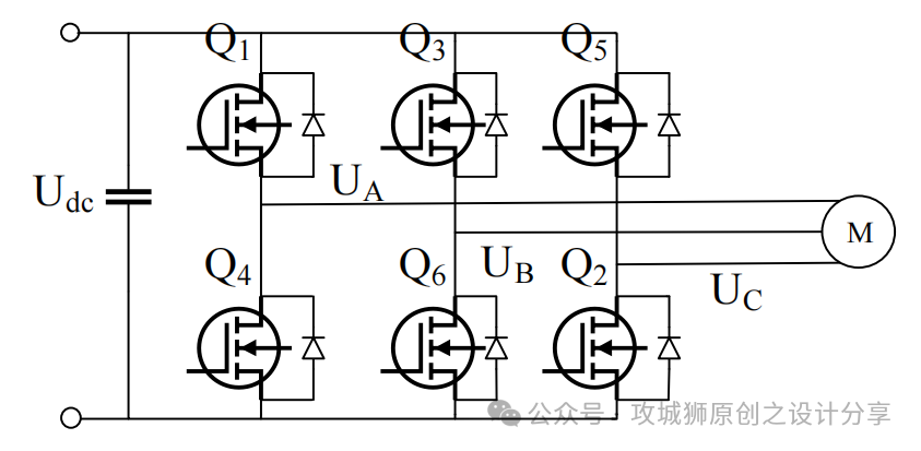 控制核心配合三相逆變器驅動:由6個MOSFET/IGBT開關構成三相全橋控制。驅動回路圖如下