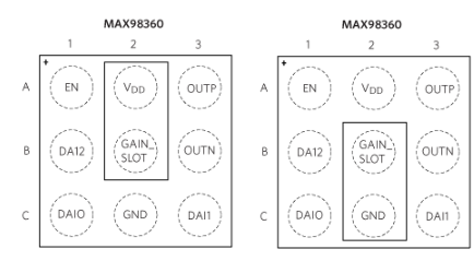 該 IC 還有另一個顯著優勢,有助于最大限度地減小電路板尺寸/成本。它采用微小的 1.9 毫米尺寸2WLP 采用巧妙的引腳布局,旨在消除對昂貴的電路板過孔的需求。如圖7所示,GAIN_SLOT引腳(位于封裝中心)可以方便地連接到VDD或 GND(直接或使用電阻器)或保持未連接以提供 I2S/左對齊增益設置如表1所示。