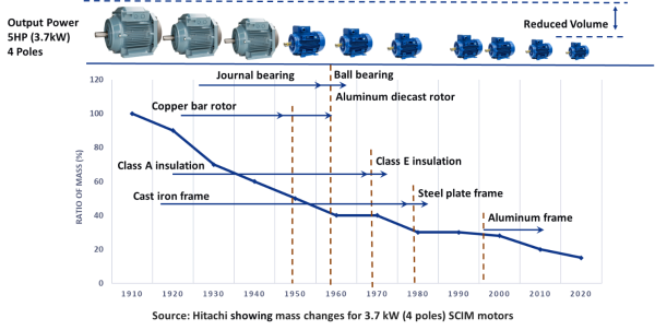 從滑動軸承到滾動軸承的轉型,對降低摩擦、提高精度從而提升電機效率起到了關鍵作用。過去一個世紀以來,電機在保持相同功率輸出的前提下實現了顯著小型化。以現代5馬力鼠籠式轉子三相感應電機(SCIM)為例,其體積大幅縮小,重量僅為1910年同功率電機的20%左右。這種尺寸縮減得益于更輕量化高效材料的應用,以及熱絕緣和電絕緣技術的進步。更輕巧的電機對汽車應用尤為有利——既可通過減重提升能效,又能將電機集成到更緊湊的空間。這些技術進步的影響深遠,造就了能效更高、性能更優且更節能的電機系統。