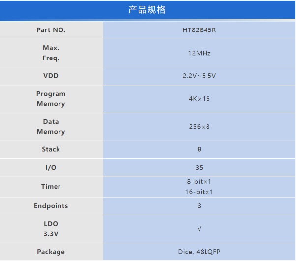 HT82B45R工作電壓2.2V~5.5V,系統(tǒng)頻率為內建12MHz振蕩器,有效簡化外圍元件。產(chǎn)品規(guī)格包含有4K × 16 OTP ROM、256 Bytes RAM、低速USB、3個Endpoints、最多35個雙向I/O、1組8-bit Timer、1組16-bit Timer以及內建3.3V LDO提供USB所需電壓,USB模式下內部12MHz 振蕩器的精準度可達到±1.5%。提供Dice與48-Pin LQFP封裝形式選擇。