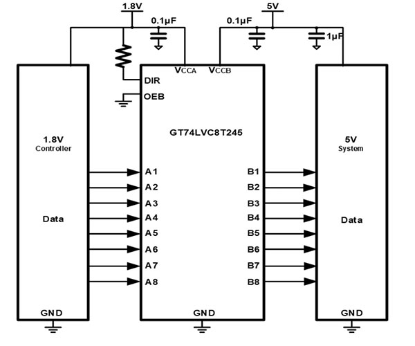 GT74LVCXTX45系列包括一路,二路,四路,八路和十六路收發(fā)器,是具有可配置電平轉(zhuǎn)換的雙電源總線收發(fā)器。最大傳輸速率可達(dá)到420Mbps,滿足高速數(shù)據(jù)傳輸要求。該收發(fā)器使用兩個(gè)獨(dú)立的電源軌,VCCA和VCCB的工作電壓范圍為1.65V至5.5V,支持寬電壓輸入。A端口參考VCCA,B端口參考VCCB,可以在1.8V、2.5V、3.3V和5.5V電壓節(jié)點(diǎn)之間實(shí)現(xiàn)通用低壓雙向轉(zhuǎn)換。具備VCC隔離特性,當(dāng)任一VCC輸入端處于接地狀態(tài),則所有輸入端均處于高阻抗?fàn)顟B(tài)。A端口和B端口的輸入電路始終處于激活狀態(tài),并具有邏輯高電平或邏輯低電平,以防止出現(xiàn)過多的ICC和ICCZ。GT74LVCXTX45的控制引腳由VCCA供電。該芯片的工作范圍為-40℃~125℃。