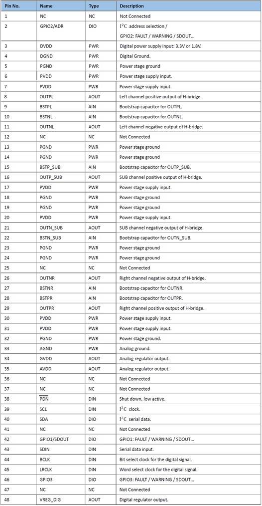 4.5V-26.4V。在2.1通道工作模式, 2 x 8 歐+4 歐負載下,輸出功率可以達到2×30W+60W ; THD+N不超過1%。采用QFP-48(散熱片在背部,支持外接散熱器),良好的散熱性能保證超大功率輸出,可實現無失真的清晰音頻。