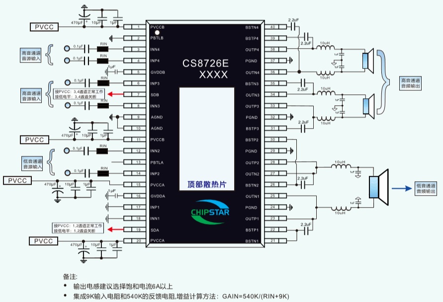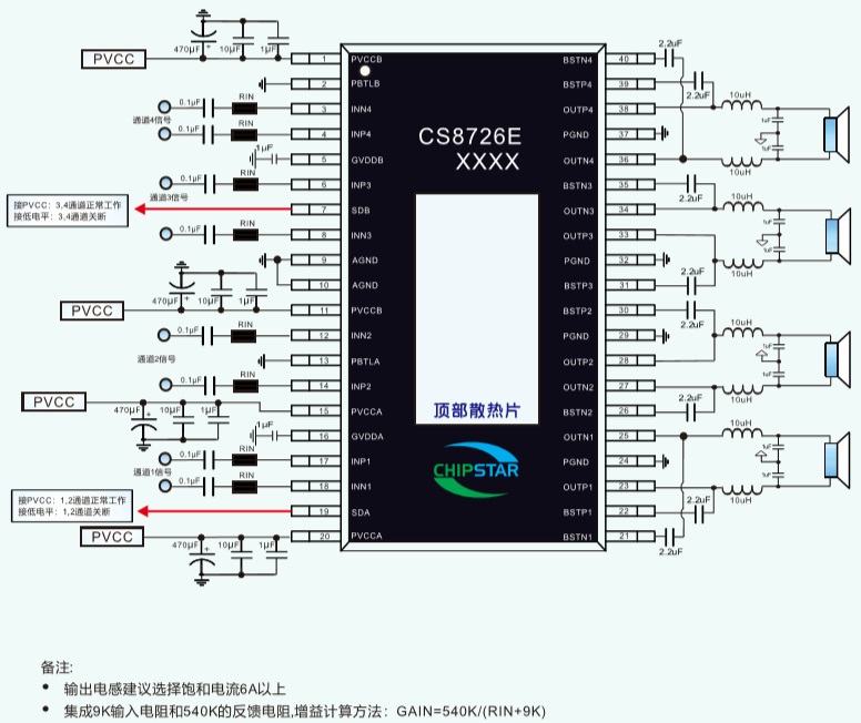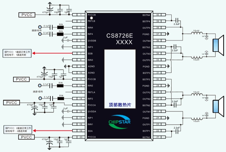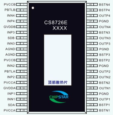 CS8726E是-款4X70W四通道D類音頻功率放大器,這款器件在頂層設(shè)計了散熱焊盤,焊盤上連接散熱器后在供電電壓24V的情況下,最大可以輸出4x70W的連續(xù)功率.