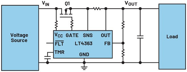 LT4363浪涌保護器件不僅會考慮流過MOSFET的電流大小,還會考慮源極和漏極之間施加的電壓。如此一來,MOSFET能夠在線性模式下更安全地運行,而且也許能夠選擇尺寸更小的MOSFET,進而降低系統成本。