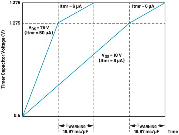 這種保護機制的工作原理是,根據所測量的電流和壓降,對圖1中TMR引腳上的定時電容器進行充電。如果電容器上的電壓上升到1.275 V以上,就會發出警告。而當電壓高于1.375 V時,MOSFET會完全關斷,以實施保護。