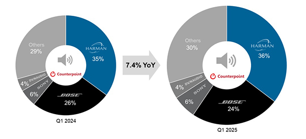 市場研究機構 Counterpoint 咨詢發布報告,目前全球乘用車音響系統市場由 Harman 和 Bose 主導,兩家廠商合計貢獻近 60% 的總銷售額