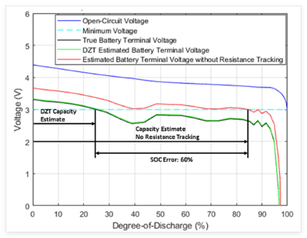當不穩定或高頻負載影響電池時,阻抗跟蹤測量儀對電池的傳統 RC 建模將無法更新電池電阻。動態 Z-Track 算法實現了一個寬帶瞬態模型,該模型可以模擬電壓瞬態并適應動態電流曲線。即使電流不穩定,這種方法也能實時估算電阻。
