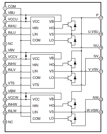 1. 三相全橋智能驅動架構內置6顆600V/6A低損耗IGBT及匹配的快速恢復二極管(FRD),實現高效電能轉換,降低開關損耗。