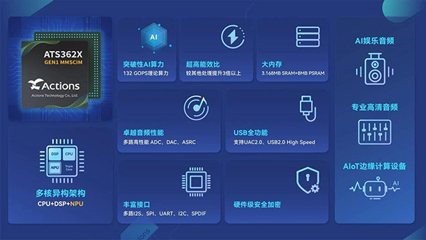 炬芯®端側AI音頻芯片ATS362X已在品牌客戶音頻產品中立項落地,深度融合低功耗設計的深厚積淀與端側 AI 的創新技術,憑借6.4 TOPS/W 的超高能效比,可支持聲紋識別、環境音分類等復雜模型在端側實現實時推理。這一特性讓音頻設備在搭載強大 AI功能的同時,仍能維持超長續航,輕松滿足全天候使用需求,為各類電池驅動設備提供穩定可靠的性能支撐。