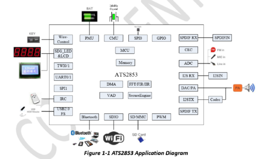 集成一整套電源管理電路、靈活的內存配置、用于UI顯示的矩陣LED控制器和豐富的接口,如SD/SDIO/SPI/USB2.0 FS/UART/TWI/PWM/IR/I²S TX&RX等;