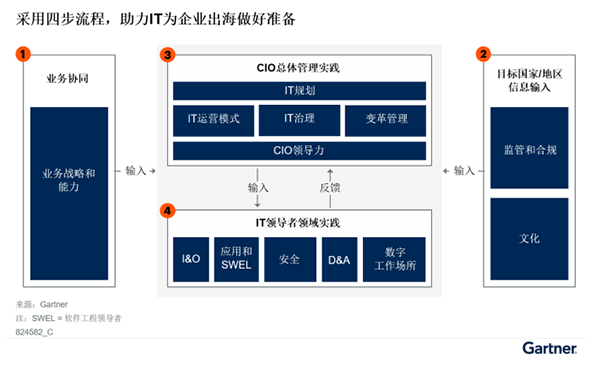受到新市場準入等業務機會和“一帶一路”等政府倡議的推動,出海成為中國企業的重要趨勢。目前,中國首席信息官(CIO)在為企業出海進行IT準備時,往往將IT視為和國內業務站點設定類似的被動支持角色,主要關注技術和服務的就緒情況,如為目標地區選擇云提供商和部署企業資源規劃(ERP)(實例),而非主動尋求業務賦能。然而,首席執行官(CEO)和業務領導者希望IT在本輪出海浪潮中發揮戰略合作伙伴的作用,不僅促進業務在當地的快速啟動,而且能夠通過數字技術塑造企業的未來,如在總部和出海地點之間建立和維護企業級的業務協同。這對許多中國CIO而言是一項挑戰,因為這是他們首次面臨此類情況。為了幫助CIO及IT領導者成功實現這一目標,Gartner制定了一個包含四步流程的綜合框架(見下圖1),為CIO領導下的IT成功賦能企業出海提供指導。