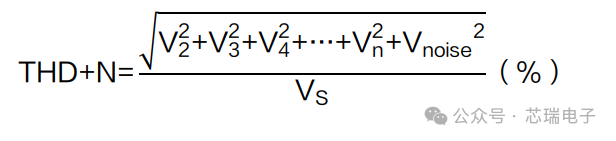 總諧波失真加噪聲(THD+N,Total Harmonic Distortion+Noise),除了關注諧波失真,也關注噪聲,是所有諧波及噪聲在指定帶寬下的影響。總諧波失真加噪聲計算公式如下: