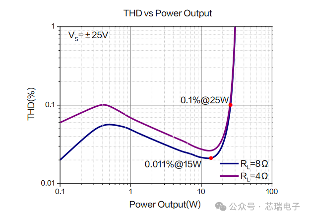 音頻運放標稱的總諧波失真 THD 一般為1%~0.01%。不同的輸入信號,不同的閉環增益,不同的輸出功率,不同的揚聲器負載會影響總諧波失真的測試值,通常也會標明相關條件,例如:THD=0.011%@15W 8Ω(輸出功率15W,負載為8Ω時,THD為 0.011%)。 失真與輸出功率的關系曲線如圖1所示,輸出功率在1~25W時,失真相對比較低,輸出功率大于25W 時,已經到了輸出極限,失真度急劇增加,會存在信號的削頂失真。