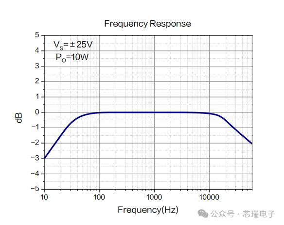 頻率響應是指音頻功放對不同頻率表現得放大性能,實際上就是測量對高頻、中頻、低頻各頻率信號的放大倍數是否均勻。理想的頻率特性曲線應該是平直的,但通常來說,音頻功放對高頻和低頻段信號的放大倍數會有所衰減,若衰減過度, 則會影響到該頻段信號的保真度。20Hz~20kHz 的變化范圍在3dB之內,如圖3所示。