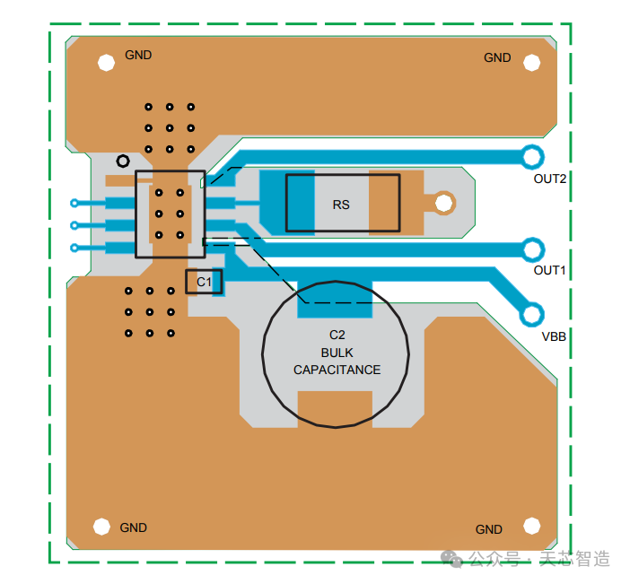 1、作為功率器件,需要考慮出線線寬與接地焊盤的地孔數量,以及電流檢測電阻的回路、功率,可參考官方給出的具體布線圖。